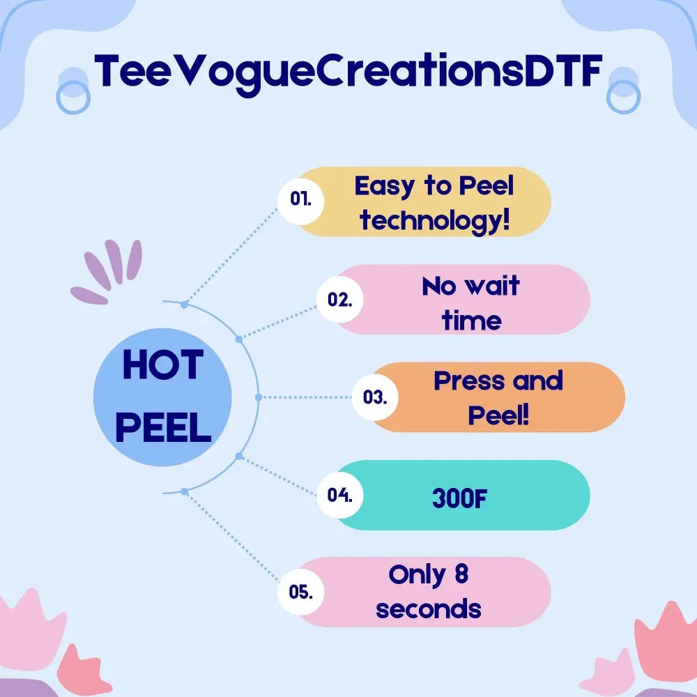 Say goodbye to long waits and hello to efficiency with our cutting-edge DTF Films. Press and peel in just 8 seconds at 300°F—no cool-down needed! Streamline your production process and deliver flawless results every time with the latest technology designed to make your work faster and easier.🌈 Application Instructions 🌈